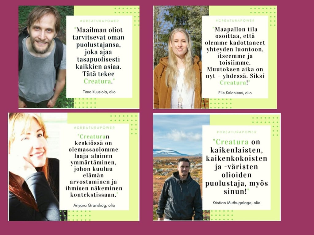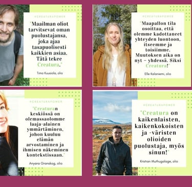 Ekologisempaan elämään siirtymisessä ensimmäinen askel on omien kulutustottumusten tunnistaminen. Creaturan hallituslaiset ovat havahtuneet oman kulutuksen ympäristövaikutuksiin. Yhdistävänä tekijänä on ollut kiinnostus ekologisen ja sosiaalisen kestävyyden haasteisiin.