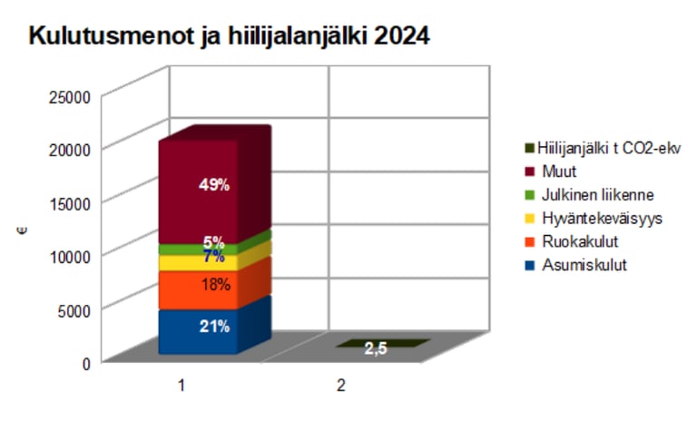Viimeisimmät kulutusperustaiset päästötiedot ovat vuodelta 2021, jolloin suomalaisten keskimääräinen hiilijalanjälki oli 7,7 t CO2 ekv/henkilö (YM 20/2025). Sitran vuoden 2019 1,5 asteen elämäntavat -selvityksessä on esitetty hiilijalanjäljelle vuodelle 2030 tavoitteeksi 2,5 t CO2-ekv, vuodelle 2040 1,4 t CO2-ekv ja 0,7 t CO2-ekv (Sitra 148/2019). Suomen ympäristökeskuksen vuoden 2019 Envimat-tutkimuksessa on laskettu myös eri tuloluokkien hiilijalanjäljet, jonka mukaan hyvätuloisimman 10% päästöt ovat noin 2,5 kertaa suuremmat kuin pienituloisimman 10% päästöt (SYKE 15/2019). Hiilijalanjälki koostuu asumisen, liikkumisen, elintarvikkeiden sekä tavaroiden, palveluiden ja vapaa-ajan kulutuksen päästöistä. Keskeiset päästölähteet, joihin yksityisellä kulutusvalinnoilla voi myös vaikuttaa ovat liikkumisen osalta on yksityisautoilu ja lentäminen, elintarvikkeiden osalta eläinperäiset tuotteet (erityisesti liha+maitotuotteet) ja tavaroiden osalta kodin kulutustavarat.